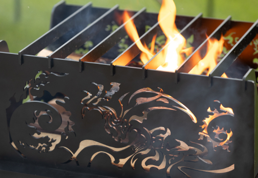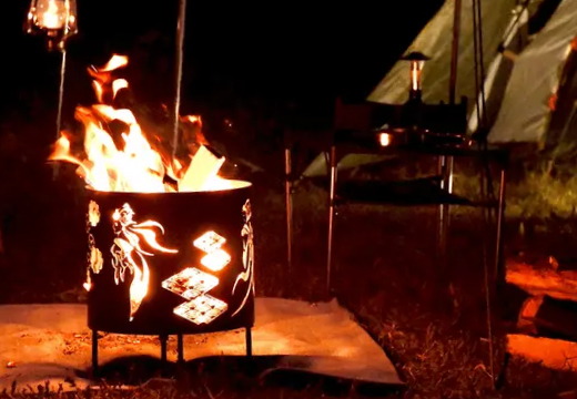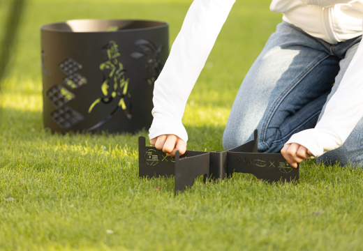 葦手絵師TOMOKO.によるアートワークを刻み込んだ大型の焚火台です。 炎に照らされた草木が朱く輝く様子「火樹」と街の灯りが銀色に光る様子「銀花」を朱雀をモチーフとして描き出した『火樹銀花』と、 "甲斐の虎"武田信玄の軍旗に掲げられた文字を虎を象って描き出した『風林火山』、またその2つを表裏に配置した3タイプをご用意いたしました。